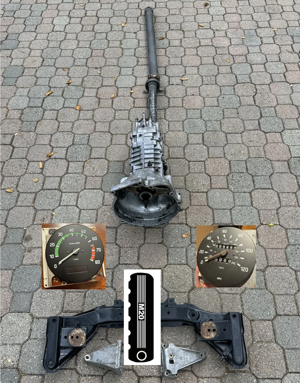 Todor lists the parts needed to do the M20 conversion and so using that as a guide I am starting to assemble the various bits needed. I stumbled upon a 5-speed overdrive 323i transmission on eBay located in Greece and somehow the seller pinged me on WhatsApp after the purchase. Based upon the seller’s many positive reviews on eBay I followed up and asked my Greek parts supplier 🇬🇷 about other 323i bits I needed to chase down. In my mind I was dealing with Milos Columbo, the Greek Smuggler character in James Bond For Your Eyes Only played by the legendary Chaim Topol. My actual Greek contact, Sotiris, was equally as helpful as Milos was for Mr. Bond and a few weeks later a large heavy box showed up at my front door containing a 323i trans, a subframe, engine mounting arms, and a 323i driveshaft (see the top picture).